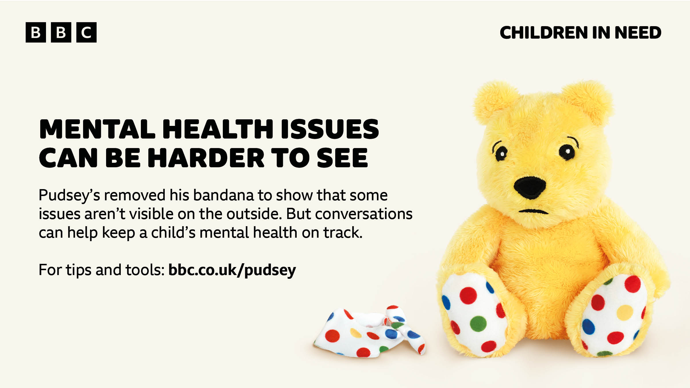 For Mental Health Awareness Week, Pudsey’s removed his iconic bandana to show that mental health issues are often less visible. We’re proud to be supporting BBC Children in Need’s ‘Behind the Bandana’ campaign which encourages conversations that can help keep a child’s mental health on track.